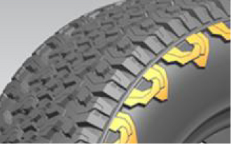 采用高耐磨橡膠和填充增強體系有效抵御惡劣路況行駛中的外部損傷,同時還能提高車輛泥地和沙地行駛的牽引性能。